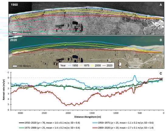 Rates and patterns of bluff change at Barter Island from 1950 to 2020. (A,B) show the same extent with bluff edge positions from 4 years overlain on images from 1950 and 2020, respectively. (C) is the same alongshore extent, with the mean decadal rate of change at each transect location plotted. The black line is the long-term 70 year mean. The record is entirely erosional except for a small extent of accretion between 1950 and 1979 associated with the construction of a landfill at the radar station. Between 2000 and 2020, retreat rates were substantially higher than the previous 25 year time periods and the rate of change on the easternmost side of the bluffs approaches 0 as a relatively persistent beach formed, providing protection to the coastal bluffs from seasonal wave attack. Imagery base is Alaska High Resolution Imagery RGB (https://gis.data.alaska.gov/pages/Imagery%20Program accessed on 1 October 2021).
