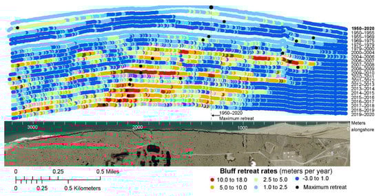 Interannual bluff retreat rates at Barter Island. Black circles identify the location of the maximum retreat for each time period. Prior to 2012–2013, maximum rates moved back and forth from the east to west side of the bluffs but after 2009–2010, maximum erosion was nearly consistently focused north of the large thermokarst lakes and erosional gullies and showed a relatively consistent westward translation of the zone of maximum retreat. Imagery base is Alaska High Resolution Imagery RGB (https://gis.data.alaska.gov/pages/Imagery%20Program accessed on 1 October 2021).