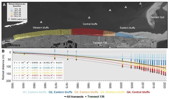 (A) Quartile distribution of bluff retreat distance identified by separate colors: Central bluffs (Q4), Western bluffs (Q3), and Eastern bluffs, which are further subdivided by moderate (Q3), low (Q2), and very low (Q1) retreat rates. (B) Cumulative bluff retreat distances for all transects within a region and at each observational time period and equations for polynomial linear regression and R2 values. Imagery base is modified from Alaska High Resolution Imagery RGB (https://gis.data.alaska.gov/pages/Imagery%20Program accessed on 1 October 2021).