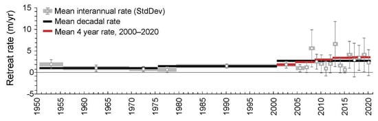 Mean annual retreat rate and standard deviation for the time periods between adjacent bluff datasets (gray), with mean long-term decadal rates (black) and 4 year mean rates from 2000 to 2020 (red) show highly variable, but consistent increase in retreat rates over the study period.