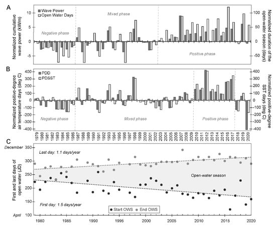 Cumulative wave power (WP) calculated at the western bluffs site, the duration of the open-water season (OWS; within at least 70 km of the coast) derived from the ERA5 reanalysis, and positive degree days and SSTs (PDD and PDSST) derived from the ERA-I reanalysis that were normalized to the 30 year mean (1979–2009) highlight long-term variability in these potential drivers of coastal change (Figure 9A,B). WP and OWS tracked similarly over the record, illustrating their interdependence with one another [,]. The two showed a consistent negative anomaly, or phase, prior to 1987, followed by a mixed phase with both positive and negative excursions from the 30 year mean. A positive phase began in 2003 that was continuous and generally increasing through time, with the exception of years 2013, 2019, and 2020 (Figure 9A). PDD and PDSST generally tracked together over the analysis period and, similar to WP and OWS, showed a negative phase prior to 1987, a mixed phase that extended through 2009, followed by a sharp increase in temperature that persisted from 2010 to 2018 (Figure 9B).