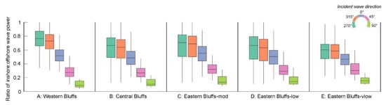 Ratio of inshore to offshore wave power along five distinct sections of Barter Island as a function of offshore incident wave directions. WB, EB, and CB denote the western, eastern, and central bluffs, respectively. Eastern bluff sections are further divided by moderate to very low bluff recession rates (see Figure 7a). Ratios were computed from wave model runs of 2000 individual events of varying wind and offshore wave conditions.