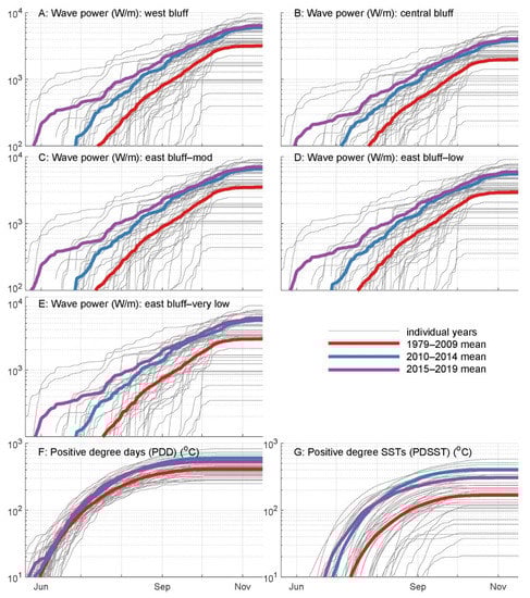 Annual cumulative sums of inshore wave power, positive degree days (PDD), and positive degree sea surface temperatures (PDSST). Solid lines show the mean annual cumulative sums calculated over the 30 year reference time period 1979–2009 and subsequent 5 year time slices from 2010 through 2014 and 2015 through 2019.