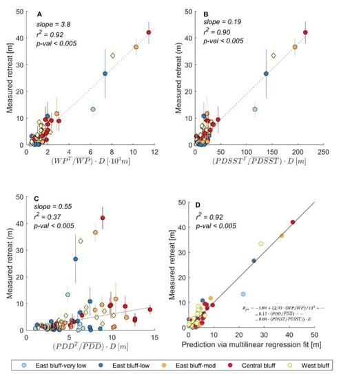 Bluff retreat rates are plotted against cumulative WP, PDD, and PDSST in Figure 12. The physical driver variables (WP, PDD, PDSST) were normalized by the long-term means multiplied by the bluff heights () to obtain units of meters to match the bluff retreat dimension. Measured bluff heights at each transect and for each time point beginning in 2009 were used when available; bluff heights were assumed to be constant for the preceding years when no data were available. Statistically significant (p-value < 0.005) least-squares linear fits were found for WP () and PDSST and only after removal of at least five outlier points for PDD ). (Figure 12A,B). To better characterize the relative contributions of each driver to the measured retreat, a multilinear regression with normalized WP, PDD, and PDSST each multiplied by was performed. The resulting slopes were found to be 2.93, 0.17, and 0.04 for WP, PDSST, and PDD, respectively (, Figure 12D). The magnitudes of the slopes indicated that recession was largely driven by mechanical thermoabrasion followed by thermodenudation. Whereas these relationships showed a pattern in an overall sense, the relative contributions of each WP and PDSST to that of PDD was expected to vary significantly across the study area due to nonhomogenous stratigraphy, massive ice content, erratic presence of ice wedges, and evolving surficial gullies.