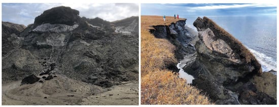 Gibbs et al. (2019) [] investigated 3-dimensional patterns of annual change on the Barter Islands bluffs over a single year that represented typical to slightly below average conditions (2014–2015). Based on the observed morphologic change and temperature and wave-impact records, they proposed seasonal patterns changed where thermal processes (thermodenudation), primarily indicated by bluff dewatering, surface sloughing, and thaw slumping, and formation of overhanging visors, likely occur throughout the ice-free season but with a relatively larger influence earlier in the season when air temperatures are warmer, daylight is longer, storms are less frequent, and waves rarely reach and erode material from the base of the bluffs. As the ice-free season continues through the summer and into early fall, mechanical and thermo-erosional (thermoabrasional) processes begin to dominate as daylight wanes, temperatures decrease, and numerous large and powerful storms driven by low-pressure storms and easterly winds bring storm surge and waves that erode material from the base of the bluffs and undercut the base through thermo-erosional niching. The loss of the bluff toe and niche development leads to destabilization of the overlying bluff material, which can lead to large block failures, rotational slumps, and surface sloughing (Figure 13). Debris aprons develop quickly once waves recede from the base of the bluffs, but likely little change occurs to the bluffs or debris aprons once sea-ice formation is initiated and is present to protect the coast. These patterns and high rates of change are believed to be broadly representative of coastal permafrost bluffs found along many high-latitude coastlines worldwide.