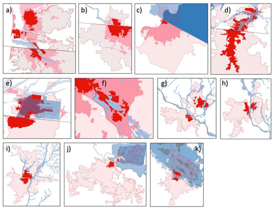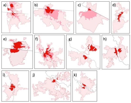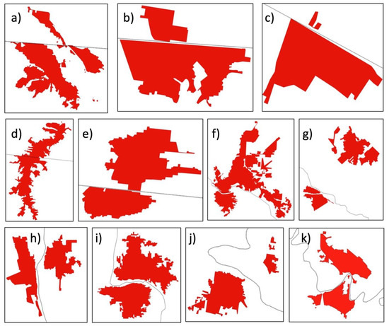 Urban areas in the 1940s–1950s extracted from aerial images; (a) San Ysidro and Tijuana 1955, (b) Mexicali and Calexico 1953, (c) San Luis Rio C./San Luis 1949, (d) Nogales 195; (e) Agua Prieta and Douglas 1958, (f) Ciudad Juárez and El Paso 1956, (g) Ciudad Acuna and Del Rio 1950, (h) Piedras Negras and Eagle Pass 1947; (i) Nuevo L. and Laredo 19, (j) Reynosa and Hidalgo 1946, (k) Matamoros and Brownsville 1946.