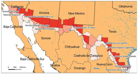 SVI 2010 for municipios in Mexico (CONABIO) and counties in the USA (CDC) along the shared border of both countries. Darker colors (red) represent higher vulnerability (data sources: Table A2).