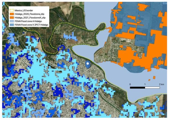 At the international level, the call for monitoring urban growth and monitoring disaster risk led to a series of strategies in urban development and disaster risk reduction [1,2]. Findings have shown that urban areas often grow into areas of increased disaster risk, such as coastal or fluvial hazard zones [3]. Global attention to a related topic of population dynamics, the migration topic [4], has lately been expanded on so-called environmental drivers of migration [5]. Cross-border assessments are in demand, too, since natural hazards such as floods do not stop at administrative boundaries [6,7]. However, human planning and activity influence risk exposure, vulnerability, and resilience differently within different administrative boundaries [8]. These differences often become most apparent along national borders, for example, by the different extents of urban development. However, what is missing so far are cross-border urban change assessments that combine urban growth and natural hazard aspects. These assessments are important since hazards such as floods, earthquakes or storms do not stop at administrative borders. However, exposure, vulnerability and preparedness vary at national borders on each side, resulting in different risk patterns. Understanding natural hazard and risk patterns cannot only help to save human lives but also can contribute to solving conflicts. For example, migration is an additional factor to consider at national borders. In 2021, between 14–16,000 immigrants from Haiti and other countries had to camp under a bridge at a Mexican-USA border city, Del Rio, a major transportation and trade hub [9,10,11]. If a flood or tornado had occurred during this time, that binational event would have become an additional human crisis. Another constraint often is data availability to warn people of hazards on both sides of a national border or to include such knowledge into spatial planning. Therefore, it is important to utilize spatial assessment capabilities to inform the public and decision-makers about the risk of natural hazards and how this risk varies across borders and develops over time.