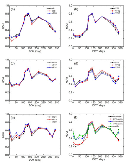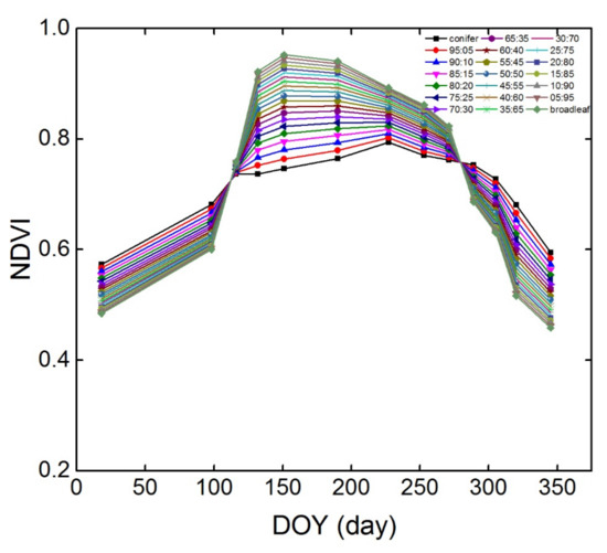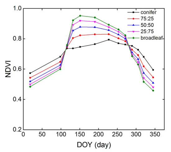The conifer-broadleaf ratio discussed in this paper is only applicable to dense forests, i.e., where the canopy is almost closed, broadleaved forests in addition to coniferous forests exist in the pixels, and evergreen broadleaf and deciduous conifers are not considered. Additionally, although the conifer-broadleaf ratio remained constant throughout the year, it could not be estimated based on single-phase images. This is because the spectral characteristics corresponding to different conifer-broadleaf ratios in a single image were highly similar. Effectively distinguishing the spectral characteristics is difficult, especially in multispectral remote sensing studies. Therefore, temporal variations in VI characteristics, such as the NDVI, were considered because the composition of conifers and broad-leaved trees, as well as their temporal variation, in a pixel, was different.