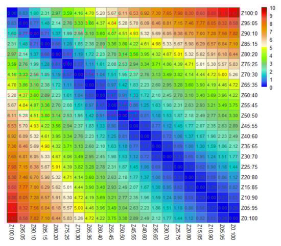 To better distinguish different conifer-broadleaf ratios and select the ratios with greater differences, we classified twenty-one different conifer-broadleaf ratios and determined the “standard/reference time-series curve” corresponding to each ratio by accounting for dual differences in the shape and distance between the curves. Based on this, we used the ED and SA distances as the separability criteria. The time-series “spectrum” was analogous to the remote sensing spectrum, comprehensively using the spectral and time-series spectrum analysis methods for reference.