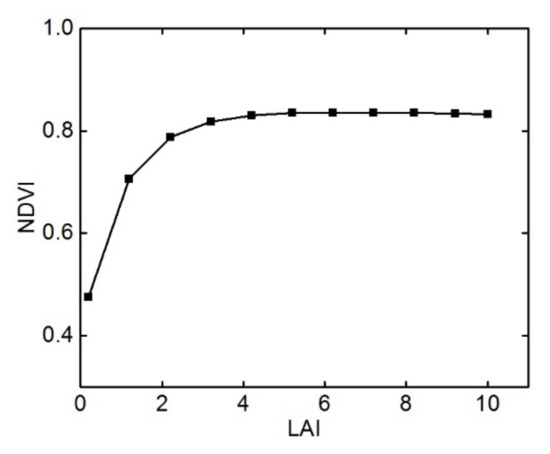As the most widely used vegetation indices, the NDVI is usually considered as the best indicator of vegetation coverage and the status of vegetation growth [31,39] and is closely related to LAI. However, based on the principle of the NDVI construction, the contrast of NIR and R reflectance is enhanced by nonlinear stretching, and the low-value part of NDVI is enhanced, while the high-value part is suppressed. As a result, the NDVI also suffers from well-known issues, such as saturation at moderate LAI levels (LAI > 3–4) and insensitivity to changes in high biomass conditions [63,64]. In this study, the broadleaved LAI measurement of the study area ranged from 0 to 10, while that of the coniferous LAI ranged from 2 to 5. The correlation between the LAI and NDVI was simulated based on INFORM (Figure 10), to analyze the influence of the canopy LAI on NDVI. As can be seen from Figure 10, when the value of LAI was 4.2, NDVI was 0.83, approximately reaching its maximum value of 0.84. Since then, as LAI gradually increased, while the NDVI remained almost unchanged; which would affect the discrimination of the NDVI time-series with different conifer-broadleaf ratios to some extent.