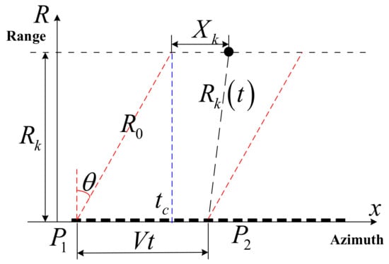 In this paper, the positive side view mode of spaceborne SAR is used for imaging. To construct an SAR imaging model, we usually use a single point target to represent the target in the scene, which is shown in Figure 1.