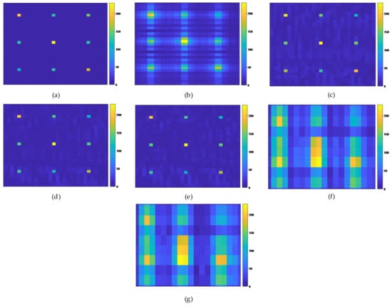 Point target imaging results. (a) is original point target, (b) is Range Doppler method, (c) is our proposed method with L = 3, (d) is our proposed method with L = 8, (e) is our proposed method with L = 11, (f) is ISTA method and (g) is Fast ISTA method.