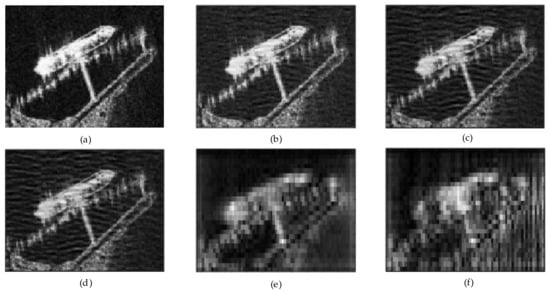 Ship targets on the sea imaging results. (a) is original ship target, (b) is our proposed method with L = 3, (c) is our proposed method with L = 8, (d) is our proposed method with L = 11, (e) is ISTA method and (f) is Fast ISTA method.