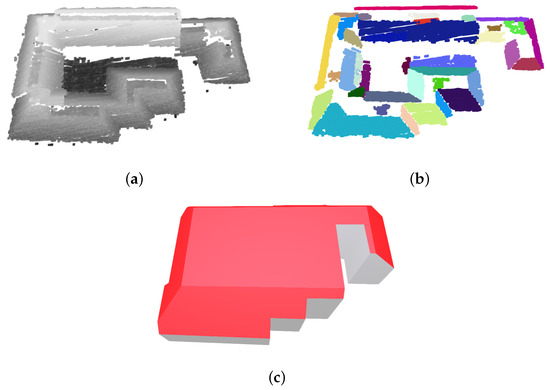 Illustration of shaping a large building with height jumps and too many obstructed half-spaces where from (a) the input point cloud segments of points (b) were obtained and only unobstructed half-spaces were considered for the reconstruction of the building (c).