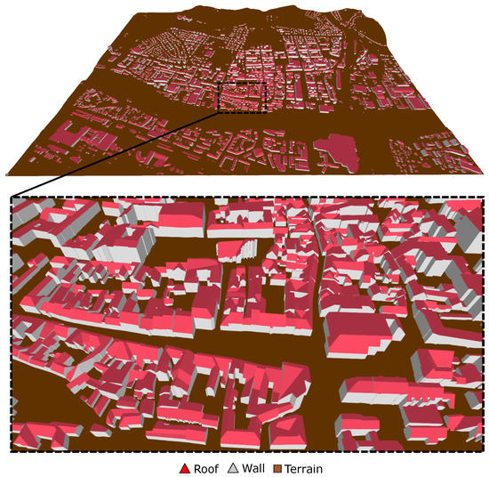To analyse the proposed algorithm’s large-scale performance, it was applied on the basis of airborne LiDAR data and 2D buildings’ outlines. The input data cover a 6.153 km2 large geographic area of the city of Maribor, Slovenia (bounding box: 46°33′8.54301″N 15°37′29.23113″E, 46°34′13.15573″N 15°39′52.97941″E). The provided LiDAR data’s average density is 11.3 pts/m2 and the considered 14,227,123 building points and 31,420,386 ground points are shown in Figure 6. Buildings’ outlines were obtained from a public spatial database maintained by The Surveying and Mapping Authority of the Republic of Slovenia. There were 5254 buildings’ outlines contained entirely within the bounding box of the area.