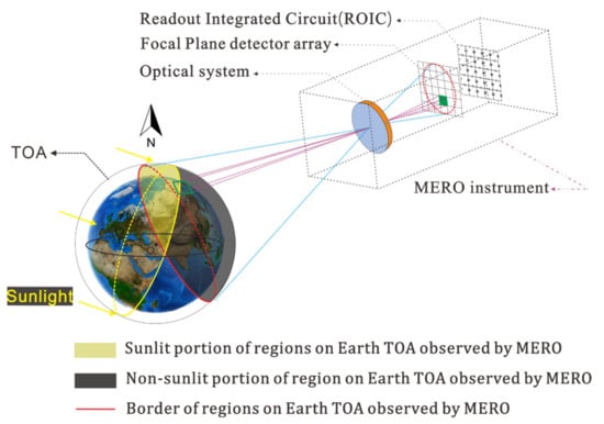 The typical observing scenario of a MERO system and the pathway of the radiation from the pixel on the Earth top of atmosphere (TOA) (hollow green rectangle) to the detector unit (solid green rectangle) of the focal plane array of the MERO.
