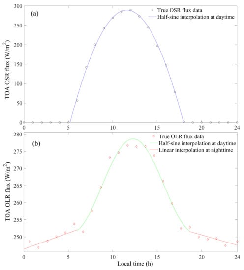 We utilized the global map of the TOA OLR and OSR fluxes of March 2019 with spatial resolution of 0.1° latitude × 0.1° longitude (10 km at equator) and temporal resolution of 1-min to serve as the true OLR and OSR fluxes. The data of March 2019 is chosen since it can make a good assessment of the measurement error at Earth’s polar regions (both the Arctic and Antarctic regions have 12 h in daytime at March). These 0.1° longtitude × 0.1° latitude-1 min OSR and OLR fluxes maps are derived through two steps: 1. spatially interpolating the 1° longtitude × 1° latitude global TOA OSR and OLR fluxes data from CERES SYN-1 dataset with the cubic spline interpolation; 2. temporally interpolating the data derived from step 1 with a combination of half-sine and linear interpolations. This is due to the fact that both the TOA OSR and OLR fluxes follow a sine/cosine pattern over the daytime and that the OSR stays at 0 W/m2 during night (whereas the OLR would keep a linear variation during the night-time) [17]. Figure 2 shows the original hourly CERES SYN flux data (discretized points) and the interpolated TOA OSR and OLR fluxes (solid lines) of a certain place (20° E, 30° S) on Earth. The 1-min true OSR flux is derived by half-sine-interpolation at daytime (0 W/m2 at night) (Figure 2a); whereas the 1-min true OLR flux is derived by half-sine interpolation during the day and linear interpolation at night of the hourly data (Figure 2b). Notably, this half-sine fit method performs well over land where there is an evident diurnal cycle of both OSR and OLR fluxes. However, this may not work well over regions where the OSR and OLR diurnal cycle is not obvious, such as ocean. This may introduce certain uncertainty to the results.
