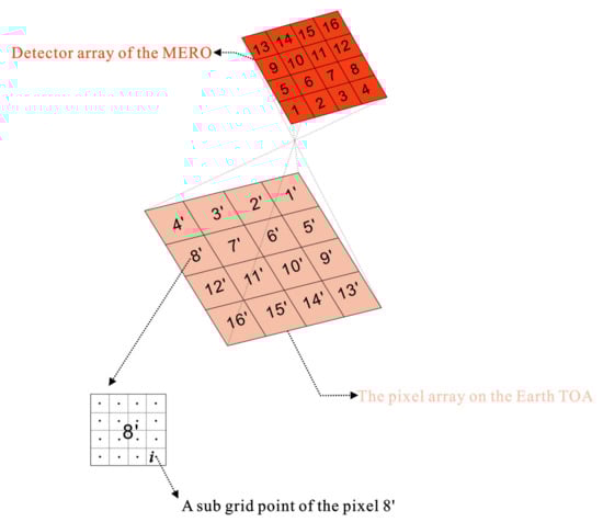 The correlation of a detector array and a pixel array of a MERO system. A pixel is discretized into sub grid points (such as pixel 8’); each sub grid point represents an Earth TOA area of 0.1° latitude × 0.1° longitude.