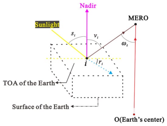 Geometries of the viewing zenith angle (vi), the relative azimuth angle (ri), the solar zenith angle (si), and Earth’s viewing angle (ωi) of a MERO sensor towards a sub grid point i within a pixel on the Earth TOA (top of the atmosphere).