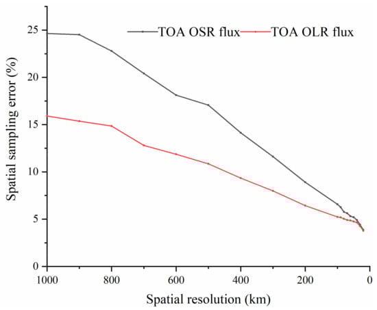 The major source of this spatial resolution induced error is the pixel mixing of TOA OSR and OLR. A pixel viewed area on Earth would usually be comprised of several endmembers. The OSR/OLR value between these endmembers are usually different due to the fact that the TOA OSR/OLR varies markedly with time and space [2]. Therefore, there will be bias between the pixel TOA OSR/OLR measurement, which is the spatial average value (see Equation (1)), and the actual TOA OSR/OLR values of the endmembers. This bias is set as the spatial sampling error of the pixel. Note that the TOA OSR/OLR of these endmembers are derived from the true 0.1-degree spatial resolution OSR and OLR in this study. To further investigate the general relationship between the spatial resolution and its induced errors for the whole focal plane array, we averaged the spatial sampling errors of all the pixels. The pixel-averaged spatial sampling error as a function of the spatial resolution of a MERO system is exhibited in Figure 5. The measurement error of Earth TOA OSR/OLR flux stays lower than 25%/17% when the spatial resolution of a MERO is finer than 1000 km. This error in the unit of percentage reduces linearly as the spatial resolution varies from 1000 km to 100 km; the rate is 2.5%/100 km for the TOA OSR flux, which is higher than that (1%/100 km) for TOA OLR flux. This is due to the larger variance of the actual Earth TOA OSR flux within the MERO pixel than that of the TOA OLR flux (this variance of OSR flux is larger than 200 W/m2, while that of OLR flux is less than 50 W/m2). The same enhancement of spatial resolution would therefore recover more actual variation details for the OSR flux than the OLR flux, resulting in more increase in the OSR flux measurement precision than the OLR flux. It is also found that the error of the OSR flux is larger than that of the OLR flux at the same spatial resolution. This is due to the fact that the spatial-resolution induced error is computed as the average of the deviations of all pixels (deviation of one pixel is the difference between the whole pixel measurement and the individual endmember true values); accordingly, the true OSR fluxes of these endmembers have a larger variance than their true OLR fluxes (the variance of OSR flux is larger than 200 W/m2, while that of OLR flux is less than 50 W/m2). It is noted that the decreasing rate of the measurement error become larger when the spatial resolution is finer than 40 km, which indicates that more precise measurement could be obtained when the MERO spatial resolution is finer than 40 km. However, as spatial resolution refines, more detector units will be required, which substantially heightens the manufacturing cost. Particularly, the increase in the manufacturing cost is almost the square of that in the spatial resolution under the assumption that the manufacturing cost is linearly correlated with the amount of detector units in the focal plane. For example, 2 times enlargement of spatial resolution would result in a 4 times increase of the manufacturing cost. These imply that the minimum manufacturing cost under a certain precision requirement could be estimated using our results shown in Figure 5. For example, a less-than-5% measurement error needs 40 km or finer spatial resolution, which means that at least 80,732 detector units are required. Conversely, if the budget of the MERO mission is ascertained, the corresponding spatial-resolution-induced error could be derived using the results shown in Figure 5.