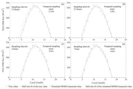 As indicated by previous studies [17,21], the continuous diurnal TOA OSR flux could be derived by the half-sine fitting of daytime samples, due to the nearly half-sine shape of the diurnal cycle solar insolation, whereas the continuous diurnal TOA OLR flux could be derived by the half-sine fit of the daytime samples and linear interpolation of the night-time samples. Therefore, the measurement error is substantially affected by the amounts of samples in the general case; more samples will result in better constraints for the interpolation of the measurement value (Figure 6), making the fitted measurement curve closer to the true value curve. For example, the sampling interval of 3.5 h make just 4 daytime OSR measurement samples (Figure 6a); the top and left slope of the half-sine measurement fit curve are poorly constrained, hence resulting in a relatively high OSR temporal sampling error (17.4%), whereas the sampling interval of 1 h could produce 12 daytime OSR measurement samples (Figure 6d), which covers almost the bottom, the left and right slope, and the peak of the half-sine measurement fit curve, therefore resulting in a smaller error (4.6%).