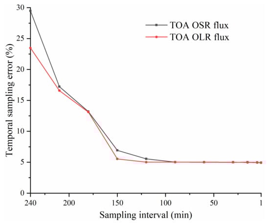 As indicated above, the sampling-scheme-induced error is comprised of two parts: the sampling-interval-induced error (Figure 7) and the sampling-sequence-induced error (Figure 10). For a MERO system with a 40 km spatial resolution, the sampling-interval-induced measurement error of the TOA OSR flux stays around 5% when the sampling interval is less than 90 min; such a threshold is 120 min for the TOA OLR flux (Figure 7). This indicates that reducing measurement error by reducing the sampling interval has a limitation under certain spatial resolutions. Since more temporal samples need better capability for data storage and transmission (higher manufacturing cost), setting the sampling interval as the measurement error threshold indicated above could guarantee the nearly smallest measurement error with the least manufacturing cost (for example, 90 min is the best sampling interval for MERO with a spatial resolution of 40 km). After the best sampling interval is set (90 min), it is necessary to ascertain the temporal sampling sequence that result in the least measurement error. It is indicated that the sampling sequence starting time of 63 min would result in a least measurement error of the TOA OSR flux, and a starting time of 64 min would result in the least measurement error of the TOA OLR flux (Figure 9b). Therefore, a sampling temporal sequence with a starting time of 64 min with a sampling interval of 90 min ought to be the optimal sampling scheme for a MERO with a 40 km spatial resolution.
