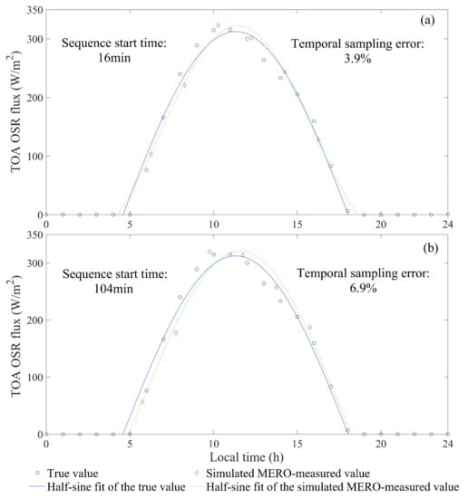As indicated in Figure 6, the shape of the estimated-MERO-measured flux fitting curve is strongly correlated with the distribution of the discretized temporal samples; if the temporal samples cover the vital control positions (the bottoms, the ascent and descent slopes and the peaks), the estimated-MERO-measured flux fitting curve would get close to the true value curve, thus resulting in less error. By contrast, fitting with the uncovering of these important positions would lead to a bigger measurement error. This indicates that a suitable sampling temporal sequence, which would alter the distribution of the discretized temporal samples under a fixed sampling interval, is crucial for a MERO mission. For example, under the fixed sampling interval of 2 h, a sampling temporal sequence with a start at local time of 16 min balanced covers the left and right slope bottoms, the ascend and descend slops and the top of the half-sine fit curve of the OSR measurement, which serves as a strong constraint on the opening extension and shape of the fitting curve (Figure 8a), whereas temporal sequence with a start at local time of 104 min (Figure 8b) tends to the left slope, making the opening extension and the shape of the fitting curve less constrained; therefore, sampling temporal sequence with a start time of 16 min would result in a smaller measurement error (3.9%) than the sampling temporal sequence with a start time of 104 min (6.9%).