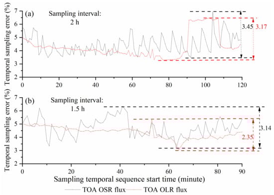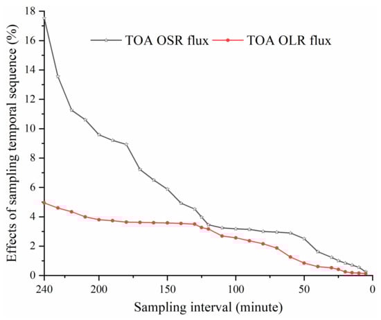 A detailed description of the effect of sampling temporal sequence on the measurement error is illustrated in Figure 9; such effects under different sampling intervals have different extent (maximum error minus minimum error). For example, the effect ranges of the OSR and OLR fluxes under 2 h sampling interval are 3.45% and 3.17%, respectively, which are higher than those under a 1.5 h sampling interval (3.14% for OSR and 2.35% for OLR). This is because smaller sampling intervals have more temporal samples, which cover larger parts of the half-sine fit curve; a change of the temporal sampling sequence would have less effect on the shape of the fitting curve, leading to less variation in the measurement error. To fully assess the sampling temporal sequence effect on the measurement error under different sampling intervals, we define the sampling temporal sequence influence at a certain sampling interval as the effect range mentioned above. For example, the effect ranges of sampling temporal sequence on measurement error under a sampling interval of 2 h for TOA OSR and OLR fluxes are 3.45% and 3.17%, respectively (Figure 9a). The full assessment of the effect of sampling temporal sequence on measurement error under different sampling intervals is illustrated in Figure 10. It is found that the TOA OSR flux has a wide range of influence from the sampling temporal sequence (0.6–17.5%), while that of OLR is relatively smaller (0.2–4.9%). This is because the amplitude of the TOA OSR flux half-sine curve is much larger than the TOA OLR flux (OSR flux is larger than 300 W/m2; OLR flux is less than 50 W/m2); the same change of sampling temporal sequence would make a larger offset to the OSR curve than the OLR curve, which would result in a more distinct OSR measurement error change than the OLR observations.