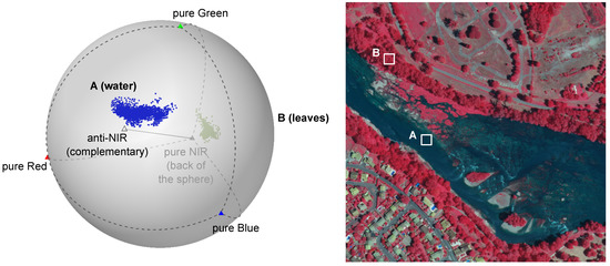 - A filter is designed to remove whitewater/white wakes in riffle areas: as these pixels appear in light gray in the visible bands (almost hueless in RGB) but with substantial absorption in the IR (typical digital counts are [0.2 0.6 0.6 0.6]), they are removed on the basis of their low saturation and high brightness in the RGB space along with a threshold in the NIR (). Note that they have nothing to do with specular reflections: the surface of water appears white there for any viewing angle, because of the scattering from the bubbles/air pockets, not from surface reflection;