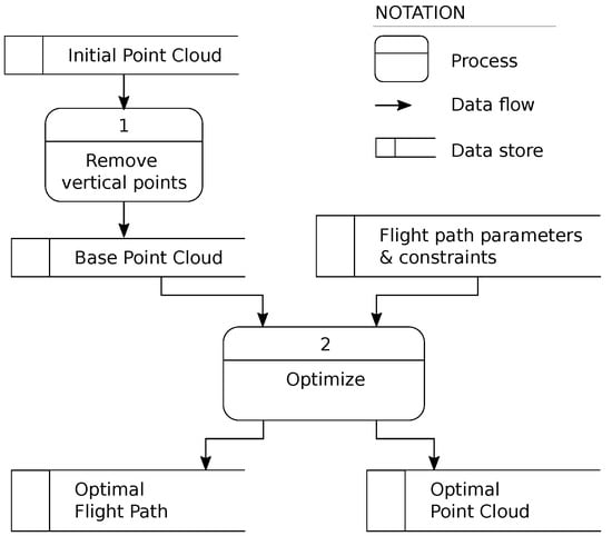 An overview of the data flow and processes employed in the research are presented in Figure 2. In addition to the flight path parameters and constraints, the optimization (Process 2 in Figure 2) requires some knowledge of the target urban environment including at least a rough representation of the street topography and building geometries. In this research, the urban environment is represented as a special kind of point cloud, called a base point cloud. A base point cloud represents the data captured in a manner that is likely to be sub-optimal for vertical surface documentation. To avoid introducing bias into the baseline data through the existence of some vertical data, the proposed approach advocates its wholesale removal. A base point cloud can be obtained by removing points on vertical surfaces from a pre-existing point cloud of the area of interest (Process 1 in Figure 2). Where a pre-existing point cloud is unavailable, a base point cloud can be generated by rasterizing any 3D model of the city []. The optimization described in the remainder of this section aims to search for the most optimal flight path in the form of one that yields the largest number of vertical points. The point cloud derived from the optimal flight path is referred to as the optimal point cloud.