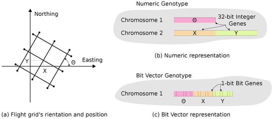 Building upon the work of Hinks et al. [], a flight grid pattern (Figure 1b) is defined. A flight grid is represented by three numeric parameters that define the orientation and position of the flight grid (Figure 3a). All three parameters are bounded, , , ; where s is the flight line spacing (Figure 3a). Two different GA representations of flight grids are considered. The first representation (called Numeric) is based on the Integer Chromosome built-in Jenetics. A Genotype (i.e., a flight grid) is composed of two Integer Chromosome (Figure 3b). The first Chromosome consists of a single (32-bit) Integer Gene that represents . The second Chromosome is comprised of two (32-bit) Integer Genes that represent X and Y. In the second representation (called Bit Vector), each value of , X, and Y is encoded as a binary string (8-bit integer) and represented as a BitVector Chromosome. A Genotype in this second representation contains only a single Bit Vector Chromosome, which is composed of 32 Bit Genes (Figure 3c). While a Numeric representation is more straightforward, it appears to be less effective, based on some preliminary testing by the authors. Specifically, the BitVector representation allows faster convergence.