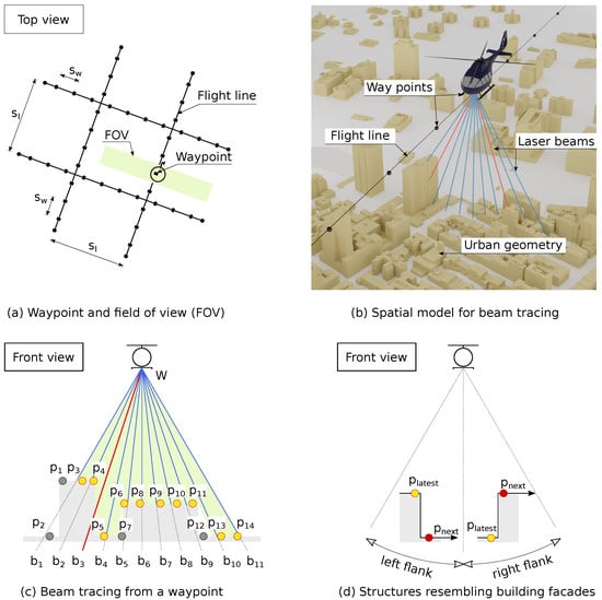 Given that a significant sidelap (>67%) is allowed between every pair of adjacent flight swaths (i.e., stripes of point data captured by a flight line), sufficient capture of the geometry of horizontal surfaces such as ground and building roofs is trivial []. Instead, the main challenge is to capture vertical surfaces such as building façades []. As such, the number of points on vertical surfaces that a flight grid generates is a straightforward indicator by which measure how good or bad a flight grid is, in terms of documenting an urban area. This is used as the basis of the fitness score. While the output is simple to understand, computing it is complex, as the simulation requires knowledge of the flight geometry (i.e., altitude, position and orientation of the flight grid), the urban geometry (i.e., buildings and other urban objects), and certain scanner settings (e.g., scan angle, angular resolution). Figure 4 illustrates the spatial model underlying the estimation of the number of vertical points that a flight grid can generate (i.e., the fitness score). The flight geometry is in all cases assumed to be composed of a set of straight flight lines separated by a predetermined, uniform flight line spacing, . Each flight line is discretized into a set of way points, spaced apart (Figure 4a). By discretizing the flight lines, the real, continuous movement of the aircraft is modeled as a discrete stepwise traverse across the way points. As previously noted, the urban geometry is represented using a base point cloud, which eliminates the need to model the complex urban environment manually or via a simplified mathematical model, which avoids any inaccuracies that could be introduced through such approaches. A scanner’s settings are usually available in equipment specification sheets and can be input directly into the simulation. Given the spatial model (Figure 4), which encapsulates the flight geometry, urban geometry, and scanner settings, laser beams can be simulated from every way point toward the portion of the base point cloud that intersects the field of view (FOV) corresponding to each way point (Figure 4c). Because the base point cloud only consists of non-vertical points, if a laser beam arrives in the vicinity a point in the base point cloud (beams − and − in Figure 4c), the laser beam is assumed to be incident on a non-vertical surface. If a laser beam does not approach any point in the base point cloud (e.g., beam in Figure 4c), then further computation (detailed in the remainder of this section) is performed to confirm whether the beam strikes a vertical surface.