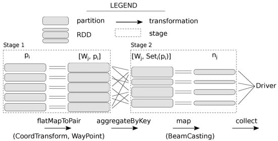 Notably, the transformations within Stage 1 and Stage 2 do not require data to be exchanged between partitions, and their data flows are confined to be within the partition boundaries. Thus, no communication between executors or nodes is needed. The CoordTransform and WayPoint transformations in Stage 1 are applied for each base point . Similarly, the BeamCasting transformation in Stage 2 is applied on each way point and a limited subset of base points () corresponding to the way point. All of those transformations are easily parallelizable, because manipulation of one record is totally independent of other manipulations and side effects. In addition, the amount of data involved in each transformation is limited. Thus, each transformation is performed in memory.