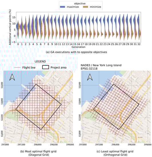 The evolution processes corresponding to the two opposite objectives are presented in Figure 9a. Each rotated bell curve represents the fitness score distribution of a generation. The blue curves represent the GA progress when the objective was maximization. The orange curves correspond to the minimization. As evident from Figure 9a, the GA operators successfully drove the fitness scores towards the defined objectives. The blue curves progressed upwards, while the orange curves progressed downwards. While Figure 9a shows all 32 generations tested, the results converged from the 10th generation for both the maxi- and minimization. The executions resulted in the most and the least optimal flight grids, as shown in Figure 9b,c, respectively. The difference in vertical point yield between the most and least optimal flight grids was projected to be approximately 13%. The most optimal flight grid was nearly diagonal to the main street axes (Figure 9b) versus the least optimal flight grid, which was nearly orthogonal (Figure 9c). This result agreed with the previous finding by Hinks et al. [] even though Hinks et al. [] arrived at that conclusion via simplistic geometric modeling. The agreement of the two approaches is attributable to the dominant rectilinear layout of the street axes in the study areas. In the remainder of the paper, the most optimal flight grid is referred to as the Diagonal flight grid and the least optimal as the Orthogonal flight grid.