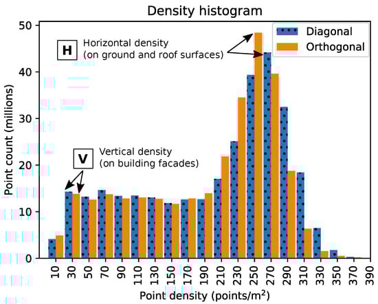 To understand the actual effectiveness of the Diagonal and Orthogonal flight grids identified by the GA in capturing vertical surface structures, the two flight grids were flown on 11 May 2019, as part of a single mission. The point clouds derived from the two flights are herein referred to as the Diagonal and Orthogonal point clouds. The point density histograms of the two point clouds are shown in Figure 10. The point density was calculated using the local point density index [], which took into account the local surface orientation.