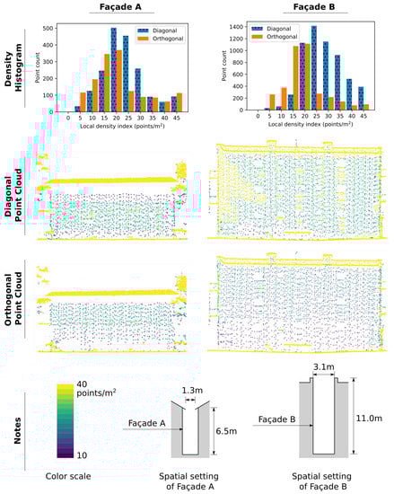 Figure 11 and Figure 12 provide a more detailed analysis of the vertical point densities of the Diagonal and Horizontal point clouds. Figure 11 shows the point distribution on two building façades A and B, which both faced a narrow alleyway. Such façades are susceptible to street occlusion and are typically missed by high-altitude ALS flights. Façade A is particularly challenging, because the space between the roof edges over the alleyway, where laser beams could enter to capture the façade, was only 1.3 m wide. Nevertheless, both façades were captured with reasonable densities and completeness in the Diagonal flight grid, as well as a significantly higher density than in the Orthogonal, as observable in both the visualization and histograms. Compared to the Orthogonal flight grid, the Diagonal flight grid captured 24% and 61% more vertical points on façades A and B, respectively. This translated to a significant difference in average vertical point density.