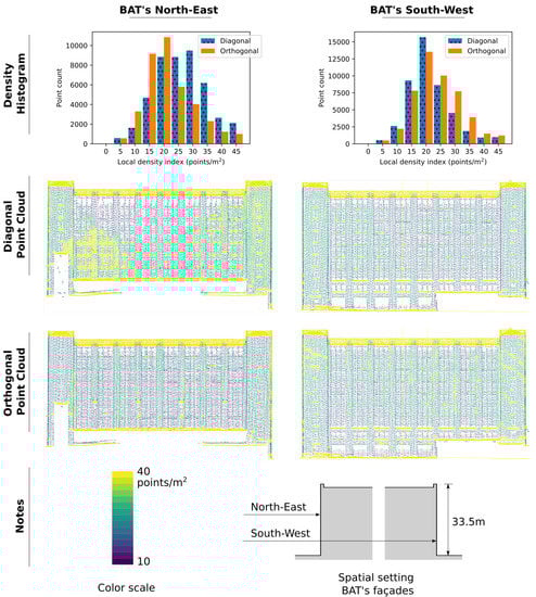 Façades not susceptible to street occlusion—the Diagonal flight grids captured more vertical points on the North East façade but less vertical points on the South East façade.