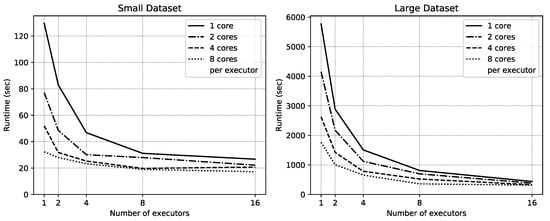 Efficiency of the lower layer of parallelization—overall, the runtime reduced when the numbers of executors and cores increased. The runtime reduction is much more obvious in the experiments using the Large dataset.