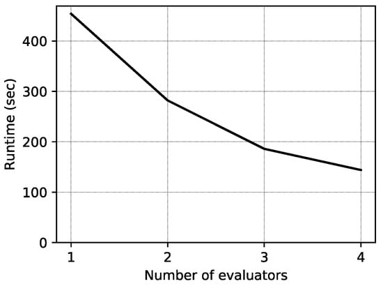 Efficiency of the upper layer of parallelization, where the runtime reduced when the number of evaluators increased.