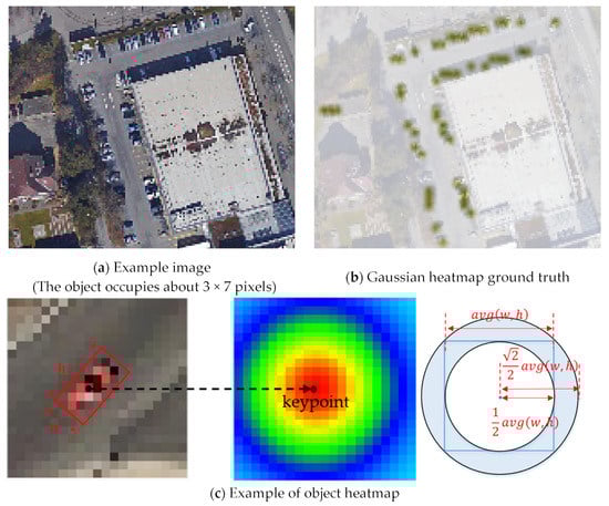 In remote sensing images, vehicle objects usually appear in a specific background; the object is correlated with the surrounding area. Thus, we adopt a 2D Gaussian heatmap to label the center of the object as the keypoint, and the closer to the center, the greater the confidence probability of the object. In the heatmap of the same keypoint, some pixels belonging to the object and background are marked at the same time. In our proposal, heatmaps are set to be ground truths at the stage of network training. Each heatmap contains the ground truth of all instances of the same category with the normalized Gaussian function whose parameters vary with the size of objects. The ground truth of the object is given by a nonstandard two-dimensional Gaussian function.