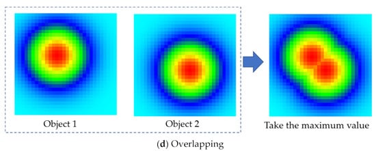The heatmaps of objects with the same are identical. We consider a square region with the length of . When the predicted position and the ground truth of the keypoint satisfy Equation (3), the Gaussian function value of the ground truth is 0.78 and we define the position as close to the object keypoint. When the predicted position and the ground truth of the keypoint satisfy Equation (4), the Gaussian function value of the ground truth is 0.61 and we define the position as far from the object keypoint. The threshold range can be used to judge whether the detection is correct in the experiment.