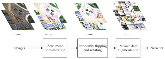 In our experiments, we divided these images into three sets, 1033 images as the training set, 295 images as the validation set and 149 images as the test set. The resolution of the images was 512 × 512 pixels. For the training of AVD-kpNet, we used the commonly used data normalization method, zero-mean normalization, which subtracts the average value of training data from the input image and then divides it by the standard deviation. Moreover, we used mosaic data augmentation. We cropped the images into small images with a size of 128 ×128 pixels; the sliding-step was 128 with a random shift from 0 to 32 pixels. After stitching 16 pictures, we obtained a new picture, and then we fed that picture to the neural network for training. This preprocessing makes the input image contain a richer background. In addition, this significantly reduces the need for a large mini-batch size. This data enhancement method has been applied in YOLOv4 [41] and achieved good results. For the inference, the input image was not cropped. Several augmentation technologies were also adopted to increase the amount of data. We randomly flipped images horizontally and vertically, and an angle was randomly chosen from (90°, 180°, 270°) to rotate the images. The normalization and augmentation sequences from the training process are shown in Figure 5.