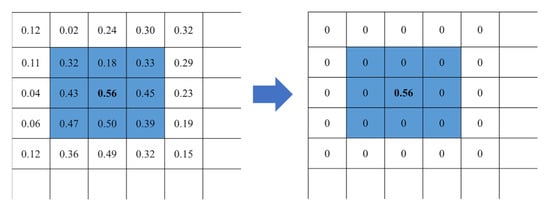 In the inference stage, the local maximum value of the heatmap is taken as the keypoint position. As can be seen from Figure 6, all the response points on the heatmap are compared with their eight adjacent points. If the response value of the point is greater than or equal to its eight adjacent points, it is retained. After finding the maximum position of the neighborhood, only the loss of offset is calculated for this point.
