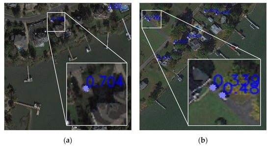 For setting the parameters of the training process, we refer to [1], and fine-tuned them in the experiment. We set the learning rate to 0.01, the epoch to 150, the batch size to 8, the stochastic gradient descent (SGD) with a momentum of 0.9 and the weight decay to 10−4. We started the training with a learning rate of 0.01, reducing 10 times every 50 epochs. We did not use pretrained weights. Figure 7 shows some examples of detection results, and Figure 8 shows some examples of enlarged images of some smaller objects.