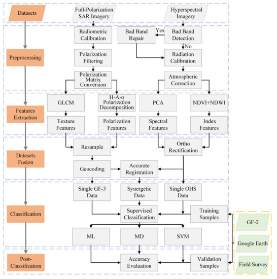 After ortho-rectification and image coregistration, the above features were classified through three classical supervised classification methods, including maximum likelihood (ML) [25], Mahalanobis distance (MD) [26], and support vector machine (SVM) [21]. In this study, to obtain the fusion datasets of GF-3 PolSAR and OHS hyperspectral data for coastal wetland classification, the layer stacking method was used to combine 11 GF-3-derived polarization and texture features and seven OHS derived spectral and index features into one multiband image at the feature level. This new multiband image includes a total of 18 bands.
