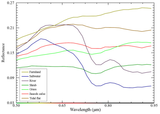 Hyperspectral images have rich spectral features, which can be combined with their derived features to carry out fine wetland classification. As shown in Figure 6, spectral values of different wetland types in OHS hyperspectral images were plotted according to the region of interest (ROI) of the training samples. The spectral curves of seven wetland types are relatively low, with the highest spectral reflectance of farmland and tidal flat and the lowest spectral reflectance of saltwater. The spectral reflectance curves of saltwater and river are similar with an absorption peak in the near-infrared band, but the spectral reflectance of the river is slightly higher than that of saltwater on the whole. Additionally, the spectral reflectance curves of shrub and grass are also similar, but the overall reflectance of grass is higher than that of the shrub. There is no obvious difference in spectral reflectance between Suaeda salsa and grass, especially in the near-infrared band, resulting in a low separability between the two types of wetlands. In conclusion, the spectral reflectance separability of the seven wetland types is not very significant, which would lead to classification errors of some wetlands and affect the accuracy of classification results to a certain extent.