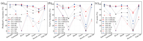 The classification results derived from the ML, MD, and SVM methods for the GF-3, OHS, and synergetic data sets in the YRD are presented in Figure 8. First, a larger amount of noise deteriorates the quality of GF-3 classification results, and many pixels belonging to the river are misclassified as saltwater (Figure 8a,d,g), indicating that the GF-3 fails to separate different water bodies (e.g., river and saltwater). Second, the OHS classification results (Figure 8b,e,h) are more consistent with the actual distribution of wetland types, proving the spectral superiority of OHS. However, there are many river noises in the sea that are probably attributed to the high sediment concentrations in shallow sea areas (see Figure 1). Third, the complete classification results generated by the synergetic classification are clearer than those of GF-3 and OHS data separately (Figure 8c,f,i). Similarly, some unreasonable distributions of wetland classes in the OHS classification also exist in the synergetic classification results, which reduces the classification performance. For example, river pixels appear in the saltwater, and Suaeda salsa and tidal flat exhibit unreasonable mixing. Overall, the ML and SVM methods can produce a more accurate full classification that is closer to the real distribution.