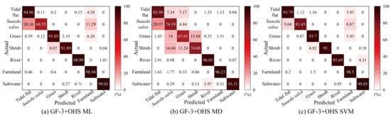 The accuracy results obtained by different classification methods for different data sets are shown in Table 4, Table 5, Table 6, and Table 7, and Figure 9, Figure 10, and Figure 11. The OAs obtained by the ML, MD, and SVM methods for the GF-3 data are 52.5%, 55.7%, and 80.7%, and the Kappa coefficients are 0.36, 0.41, and 0.70, respectively. The above classification accuracy is the lowest of all classification processes, possibly due to common wetland structural conditions. In contrast, the OAs with the ML, MD, and SVM methods for the OHS data are 96.7%, 87.6%, and 95.6%, and the Kappa coefficients are 0.95, 0.82, and 0.94, respectively. This may be attributed to the increased spectral separation capacity of the biochemical characteristics of wetland types. Subsequently, the classification accuracy after data fusion is improved by approximately 30% compared with the GF-3 data alone. This is mainly due to the consideration of the biophysical and biochemical changes that occur with the change in the phenology of wetland types.