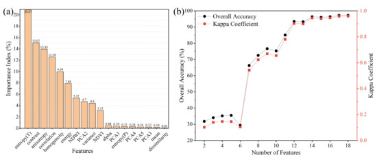 (a) Ranking of the importance of the features used for synergetic classification. Entropy (T) and entropy (P) represent the entropy of the GF-3 texture feature and polarization feature, respectively. (b) The accuracy metrics of feature sets.
